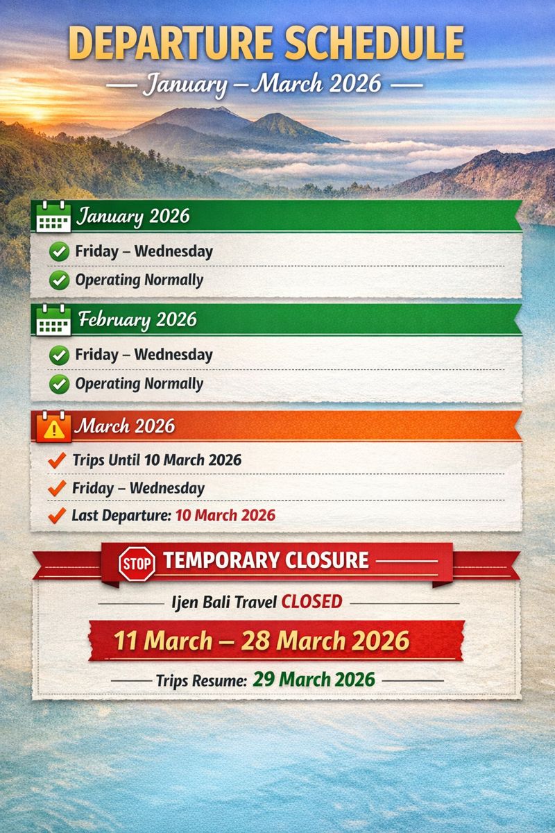The Bromo Ijen 3D2N Tour is the most recommended volcanic adventure for travelers visiting Bali or Java. With its combination of sunrise viewpoints, dramatic landscapes, rare natural phenomena, and cultural experiences, this tour delivers everything you need for a memorable journey across East Java.